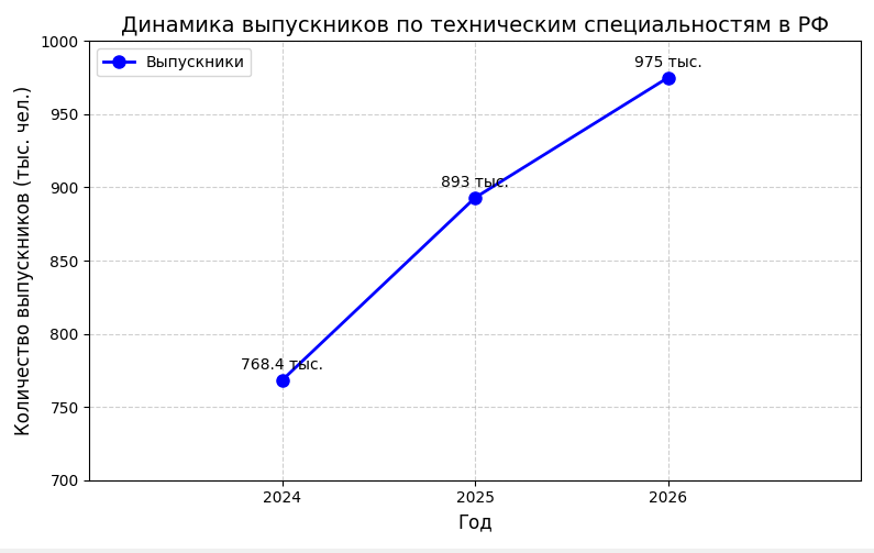 - Система образования станет узким местом. Текущая структура подготовки кадров, вероятно, не успевает за запросами экономики. Ключевой риск — дефицит инженеров, технологов и рабочих высокой квалификации при одновременном перепроизводстве юристов и экономистов.